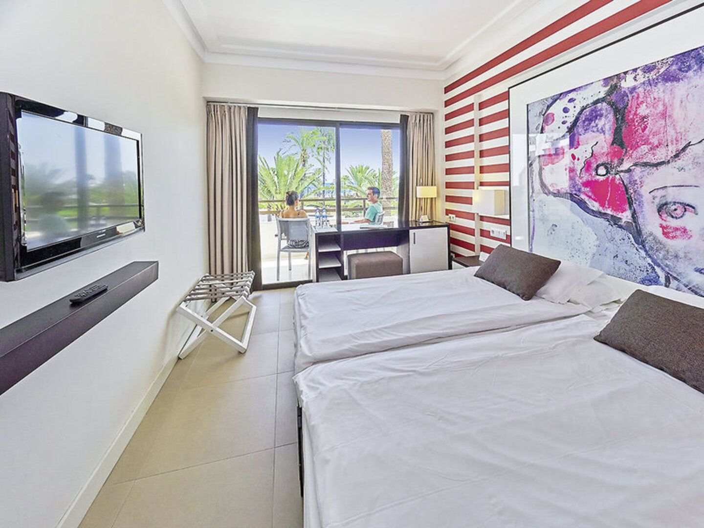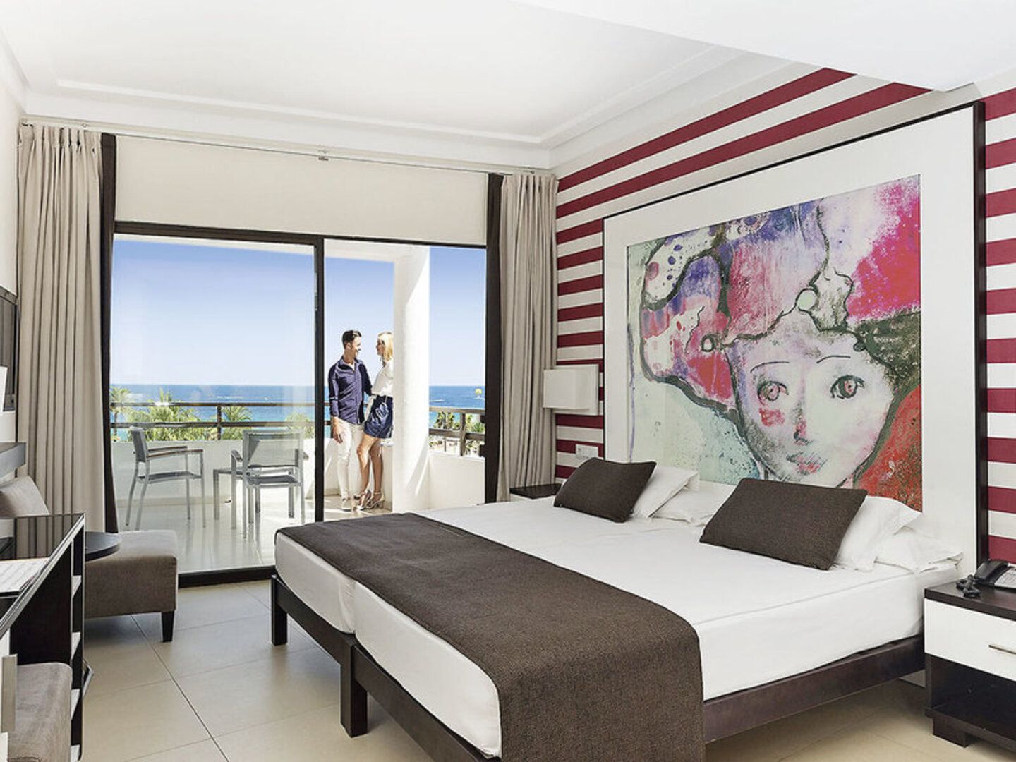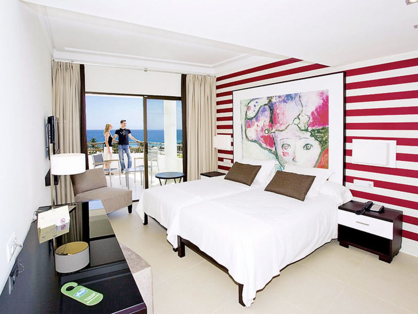 Doppelzimmer (DZ, DZ3, ca. 20 qm), elegant eingerichtet, Klimaanlage (warm/kalt), Minikühlschrank, Kaffeekapselmaschine (auf Anfrage, Kapseln geg. Geb.), TV, Telefon, Mietsafe. Bad mit bodengleicher Dusche oder Bad/Dusche, WC, Föhn. Terrasse/Balkon. Wahlweise seitlicher Meerblick (DSM) oder Meerblick (DZM, DM3). Max. 3E