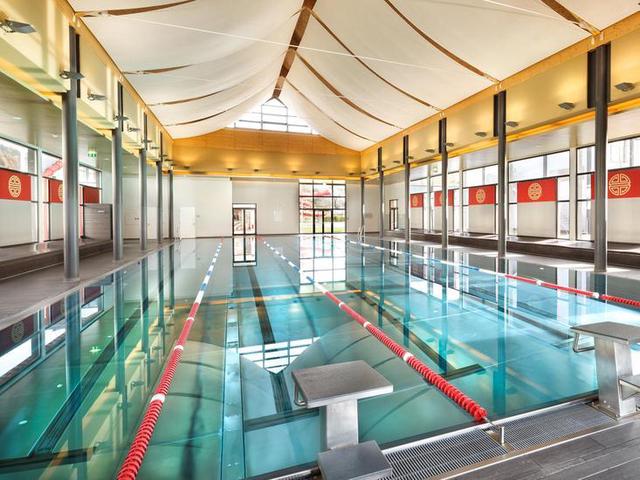 Aubad mit Wasserrutschte, Sportbecken und Liegewiesen im Sommer