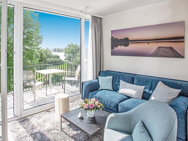 Appartement (APS, ca. 51 qm), Typ Aurora, Wohnraum, separates Schlafzimmer mit Doppelbett, voll ausgestattete Küche mit Backofen, Geschirrspüler, Kühlschrank und Kaffeemaschine, TV, WLAN (inklusive), Mietsafe. Dusche, WC, Föhn. Balkon mit Seeblick