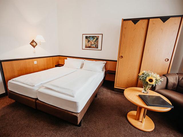 Doppelzimmer (DZ4, ca. 27 qm), Typ Bergmann, mit 2 Zustellbetten, TV, WLAN (inklusive). Bad, WC, Föhn. Max. 2E+2K, buchbar lt. System
