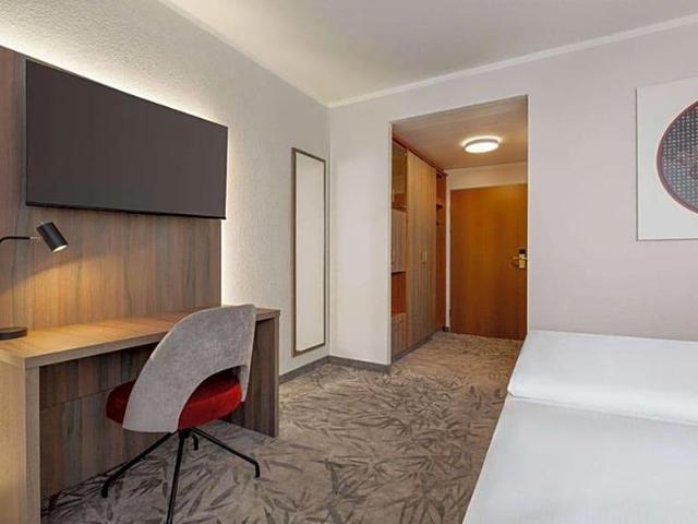 Facilities and services include air conditioning, limited reception (06:00–22:30), bar (extra charges), breakfast room (extra charges), car parking, wellness lounge and sauna parlor (extra charges), massage (extra charges), pets allowed on request (extra charges), restaurant (extra charge), meeting facilities (extra charge), conference facilities (extra charge), elevator, and Wi-Fi. The room features complimentary Wi-Fi, a flat-screen TV, a desk, seating area, hairdryer, full-length mirror, bathroom, and air conditioning. Address: Hotelstrasse 1, 06184 Kabelsketal, Germany