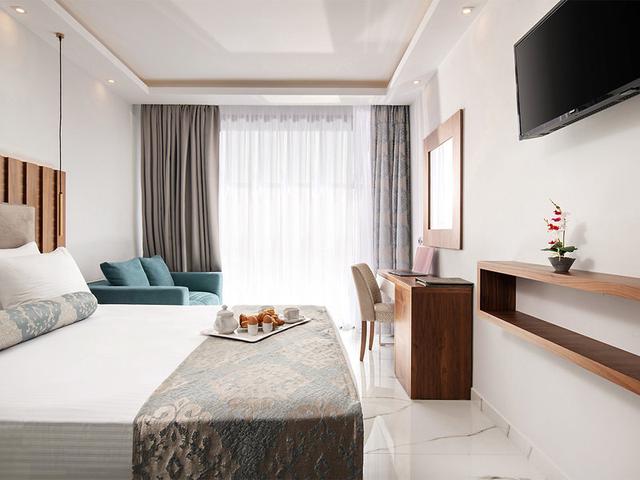 Suiten (SU, ca. 32 qm), modern eingerichtet, sep. Schlafbereich, getrennt durch eine Glasschiebetür, Klimaanlage, Kühlschrank, Espressomaschine, Kaffee-/Teezubereiter, Smart-TV, Telefon, WLAN, Safe. Dusche, WC, Föhn, Bademäntel, Slipper. Balkon. Max. 4E