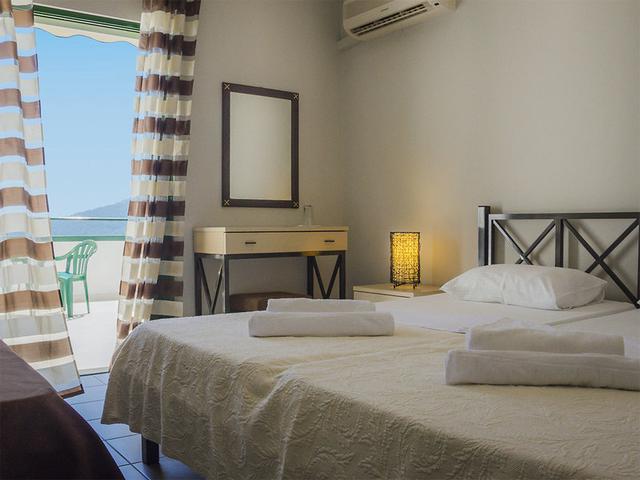 Lage: Ca. 300 m oberhalb des sanft abfallenden Sandstrandes und bietet einen atemberaubenden Blick über die gesamte Bucht. Dank seiner Hanglage genießen Sie hier ein einzigartiges Zusammenspiel von Meer und Landschaft. In der Umgebung befinden sich gemütliche Tavernen, Bars und kleine Supermärkte. Das Bergdorf Panagia, mit seinem authentischen Charme, erreichen Sie nach etwa 4,5 km und es lädt zu idyllischen Entdeckungstouren ein.