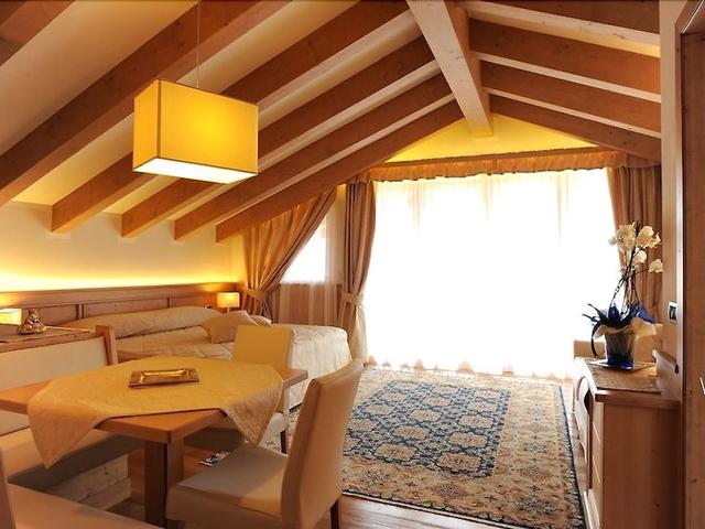 In den Zimmern gibt es eine Heizung. Die Gäste können den Bergblick von Balkon oder Terrasse genießen. Die Zimmer verfügen über ein Doppelbett, ein Queensize-Bett oder ein Sofabett. Zustellbetten können angefordert werden. Außerdem sind ein Safe und eine Minibar verfügbar. Darüber hinaus sind ein Telefon, ein TV-Gerät und WiFi (ohne Gebühr) vorhanden. Die Badezimmer sind ausgestattet mit einer Dusche, einer Badewanne und einem Bidet. Des Weiteren ist ein Haartrockner vorhanden. Das Haus bietet Familien- und Nichtraucherzimmer.