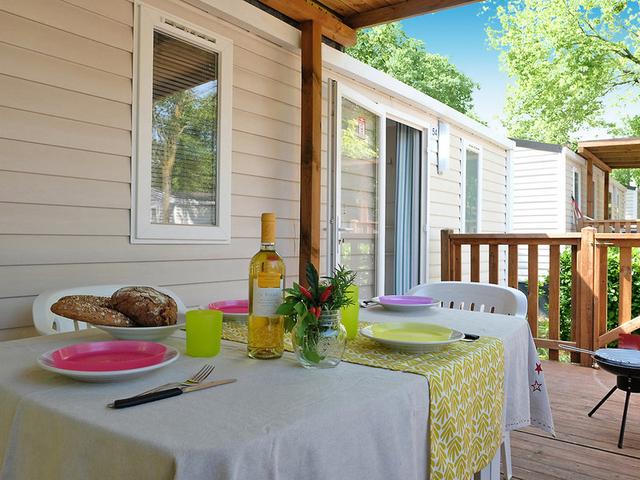 Happy Premium-Mobilehomes (MP6, ca. 29 qm), Klimaanlage, Wohnraum, Schlafbank, 3 Schlafzi. (1x Doppelbett, 2x 2 Einzelbetten), Küchenzeile. Dusche, WC. Halbüberdachte Terrasse, kleiner Elektrogrill. Max. 6E