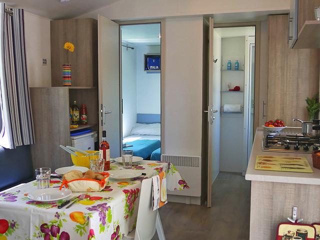 Wohnen: Happy Premium-Mobilehomes (MP7, ca. 29 qm), Happy Premium, Kimaanlage, Wohnraum, Schlafbank, 3 Schlafzimmer (1x Doppelbett, 2x 2 Einzelbetten), Küchenzeile. Dusche, WC. Halbüberdachte Terrasse, kleiner Elektrotischgrill. Max. 7E