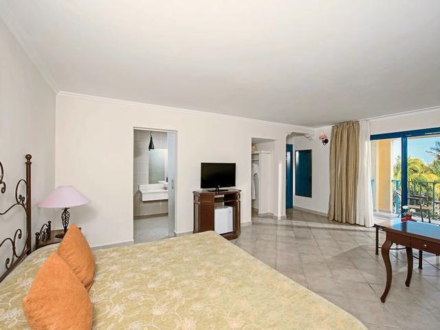 - 41-45 qm, Doppel, Poolblick, Sitzecke, 1 Bad, Dusche, WC, Haartrockner, Kosmetikspiegel, Klimaanlage, Minibar, Auffüllung täglich, Wasser, Safe, Bügelbrett, Bügeleisen, 1 TV (Sat-TV), Balkon oder Terrasse (möbliert)