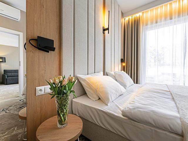 - 51-60 qm, Appartement, Deluxe, Neubau, separates Schlafzimmer, separater Wohnraum, Schreibtisch, Doppelbett, Sofabett, 1 Bad, Dusche, WC, Bademantel, Haartrockner, Klimaanlage, Safe, 2 TVs, WLAN, Kochnische, Wasserkocher, Kühlschrank, Balkon