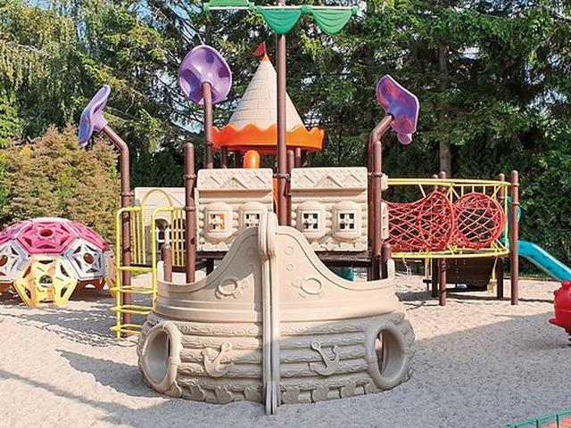 - Spielplatz mit Sandkasten und überdachte Spielhalle