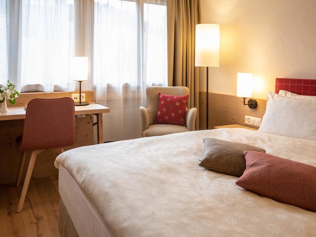 Kategorien (Unterkunft, Kabinen, Tickets): DZ1/EZ1: Doppelzimmer Alpine renovierte Queen-Zimmer (ca. 19 m²) für 1-2 Personen mit Queensize-Bett (1,60 m) Bad oder Dusche, WC, Föhn, Parkettboden, Telefon, WLAN, Radio, TV, Safe und Minibar sowie Aussicht auf Gstaad. DZ2/RZ2: Doppelzimmer Panorama renovierte Zimmer (ca. 27 m²) für 2 Erwachsene und 1 Kind bis 15 Jahre, mit Doppelbett und Zusatzbett auf Anfrage, Ausstattung wie DZ1, jedoch größer mit Teppich- oder Parkettboden, Balkon und Aussicht auf die umliegenden Berge.