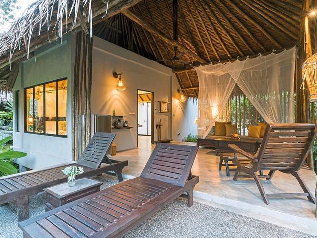 - 71-80 qm, Villa, Deluxe, Gartenblick, Bettwäsche, Handtücher und Matratzen aus 100% Bio-Baumwolle, Außendusche, separates WC, Bademantel, Badeslipper, Haartrockner, Klimaanlage, Safe, TV (Kabel-TV, Flachbildschirm), Kaffee/Tee, Kühlschrank, Terrasse (möbliert)
